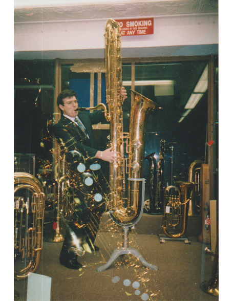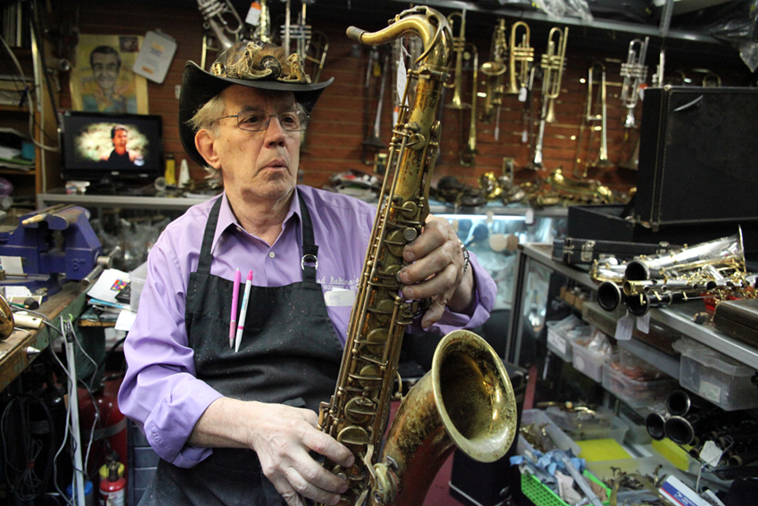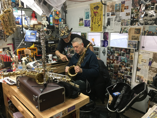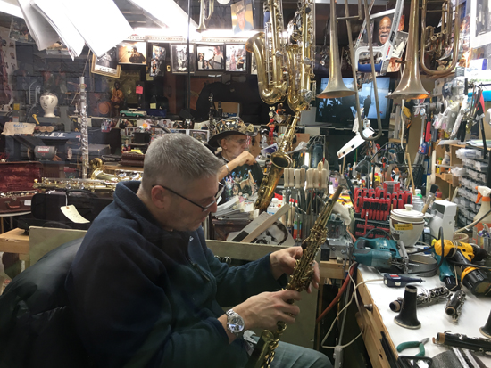 ROD BALTIMORE TESTS OUT TENOR SAX IN HIS SHOP |